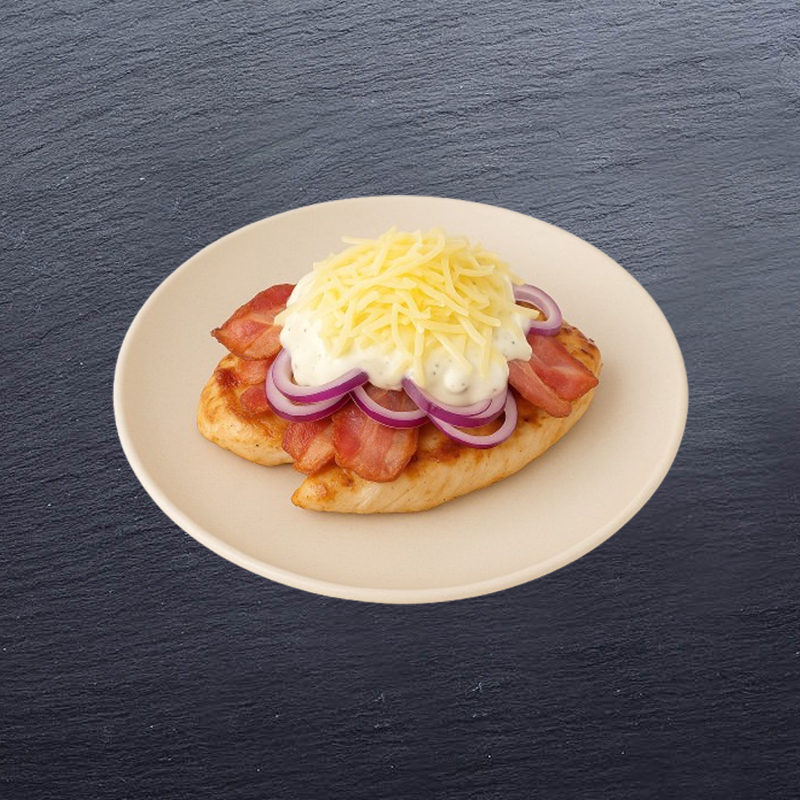roston sült csirkemell, bacon szeletek, lilahagyma, fokhagymás tejföl, trappista sajttal