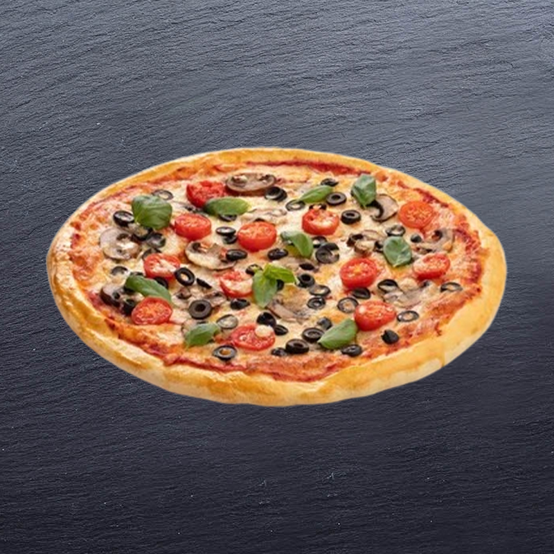 paradicsom szósz, kukorica, lilahagyma, paradicsom, gomba, édes pfefferoni, trappista sajt, ruccola